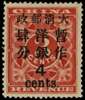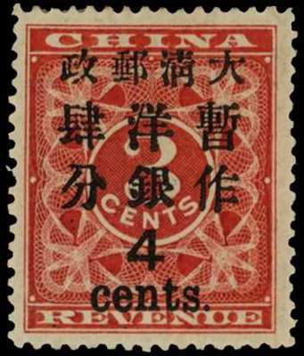 1897 Red Revenue 4ct on 3ct deep red, large figures surcharge (SG type 19), part o.g; (a little heavily hinged), still of fresh appearance. SG 90 Chan 89
