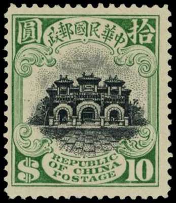 1914-19 Peking printing $10 black and green, part o.g. A heavily hinged, still collectable example of this high value with fresh appearance. SG 307