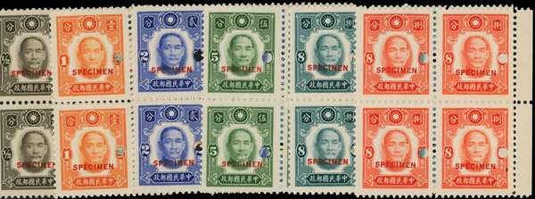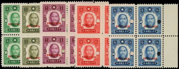 1941 Sun Yat-sen (4th issue), short set of 11 to 50c deep blue in right marginal blocks of 4, each opt specimen in red and with punch hole through right value tablet, fresh unmounted o.g., from the ABNCo archives