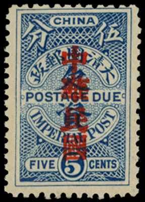 1912 5c blue postage due bearing Shanghai Statistical Department republican overprint, fine o.g., very scarce. SG D211