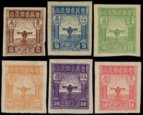 North China-Shanxi-Hebei-Shandong-Henan Border Area, 1946 (Mar) "Eagle on Globe" imperf set of 6 to $10 (100) orange, fine unused. SG NC90A-95A