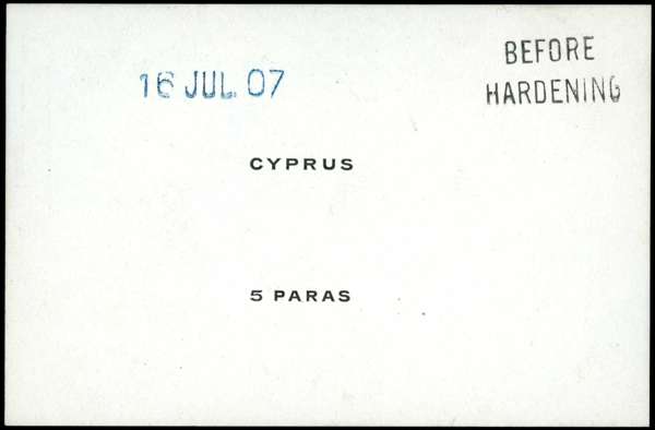 PROOF: 1907 De La Rue die proof for '5 PARAS' duty tablet in black on glazed card, endorsed 'BEFORE HARDENING' and dated '116 JUL.07' SG 60var