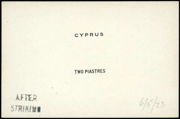 PROOF: 1922 De La Rue die proof for 'TWO PIASTRES' duty tablet in black on glazed card, endorsed 'AFTER STRIKING' and dated '6/523', fine SG 93var
