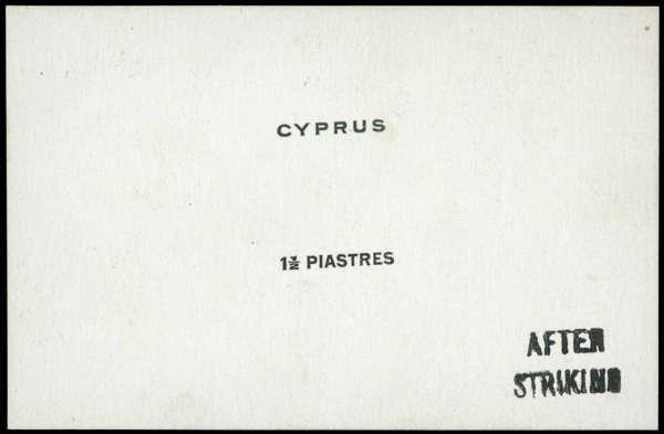 PROOF: 1925 De La Rue die proof for '1½ PIASTRES' duty tablet in black on glazed card, endorsed 'AFTER STRIKING' fine SG 120var