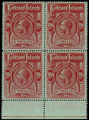 1912-20 10/- red on green lower marginal block...
