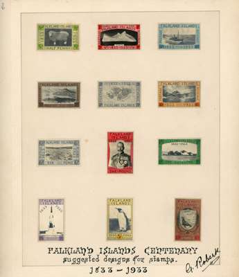 1933 set of twelve stamp sized photographic essays for the Centenary set in different designs, hand-coloured and mounted on thick card endorsed and signed by the artist G. Roberts at foot, with annotation 'Original copy of Stamps submitted to the selection Committee G. Roberts'' on reverse; an attractive and scarce set of proofs, a must for any Centenary set study or display. SG 127-138var