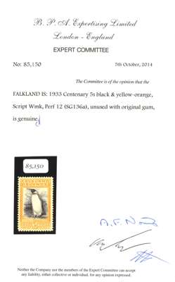 1933 Centenary 5/- black and yellow-orange ''King Penguin'', brilliant o.g; with the barest trace of hinging, a very fresh example of this shade, choice quality. Only 1320 printed of which many were destroyed. BPA Certificate (2014) SG 136a,