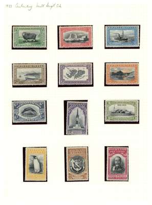 1878-1952 mint and used collection on leaves. We note 1891-1902 QV range with shades to 4d, 1898 2/6 and 5/-, 1904-12 values to 5/- with shades and duplication, 1912-20 KGV high values to £1, 1929-37 'Whale & Penguin' set used, 1933 Centenary set to £1 black and carmine (sadly with some toned perf tips), 1938-50 set to £1 and used with some shades, 1952 set to £1 and some covers, generally fair to fine condition, a lot with much retail potential.