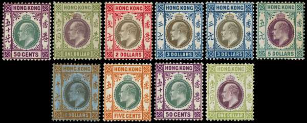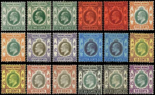 1904-06 KEVII set to $10 wmk multi crown CA, with extra shades and some chalky surface paper varieties, $2 (large part o.g.), $3 (two examples, part o.g,), $5 uneven toning on reverse, $10 (light toning on perf tips on gum side), mixed condition with some fine