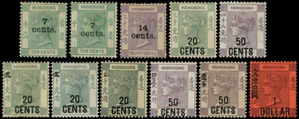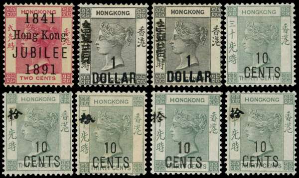 1891-1898 Selection of QV surcharges and overprints on two stock cards, includes 1891 14c on 30c mauve (small part o.g. and a few short perfs), 50c on 48c dull purple (regummed), $1 on 96c purple on red with additional Chinese characters (redistributed gum), 2c Jubilee ovpt (part o.g.), 1898 $1 on 96c black (2, both with disturbed gum), 10c on 30c grey-green (regummed), mixed condition, inspection recommended