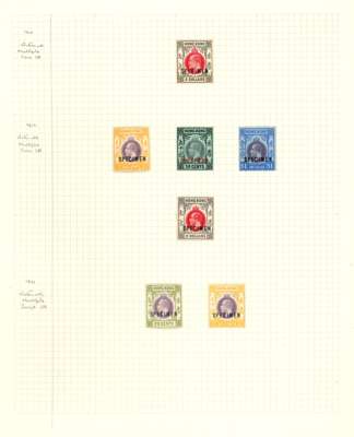 1910-1962 mint collection mounted on album leaves. We note 1910 $2 optd SPECIMEN, 1912-21 Wmk Multi CA set to $10 with shades of 2ct, 4ct, 12cts and 50cts with paper types, 25ct with Chinese character corrected (SG 109), 1921-37 Wmk Script set to $5 and 4ct block of four showing broken character variety, 1938-52 values to $10 (both) with listed perf types and shades, 1954-62 set to $10 and page of loose KGV SPECIMENS, fine condition mostly fresh.