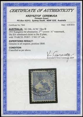 Second Watermark: 1915 6d ultramarine Die IIA SUBSTITUTED CLICHÉ (R.10/6) used by crisp Parcel Post cds for NOV 15, one shortish perf at foot, still a very fine and scarce stamp. Ceremuga Opinion (2010) SG 26b; BW 18Aja