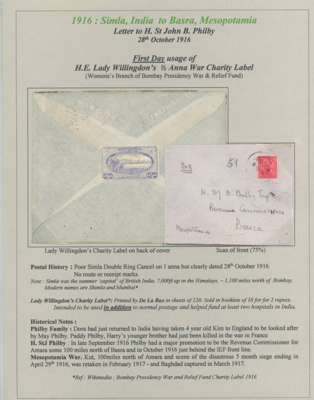 POSTAL HISTORY: 1916 Philby envelope to Basra franked with 1911-23 1a carmine tied by 'SIMLA/28 OCT 16' ds, the reverse bearing untied H.E. Lady Willington's ½a War Charity label in lilac, the first day for the use of the label. An interesting Philby cover. Fine and very unusual