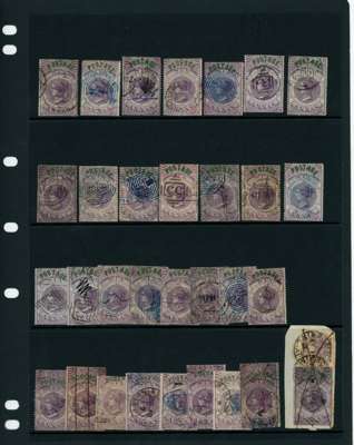 1866 6a purple provisional opts type 15 & 16 on Foreign Bill, comprising no less than 22 examples of type 15 and examples of type 16 with one on piece with 8p mauve (paying the 6a8p rate via Marseilles) used, mixed condition in places with fine, mostly neat cancels. SG 66/68