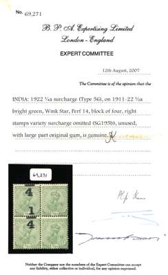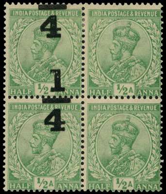1922 ¼a on ½a bright green surcharge type 39, block of four showing surcharge grossly misplaced vertically, thus each horizontal pair has variety SURCHARGE OMITTED in horizontal pairs with normal, brilliant o.g; a spectacular and scarce item. BPA Certificate (2007) SG 195b