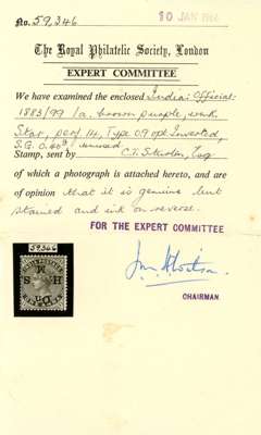 OFFICIAL: 1883-99 1a brown-purple, type 9 'On. H.M.S.'' opt error OVERPRINT INVERTED, part o.g; small faults on reverse, still of fine appearance and rare. RPS Certificate (1966) SG O40a