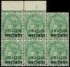 1896 2a6p yellow-green, type long Hindi opt, block of six with centre stamp in top row showing error 'GWALICR' (R1/5) from the May 1896 printing, brilliant o.g; couple of minor surface stains, still a fine and very rare piece with only 26 of this error possible and desirable in this positional form. SG 23a