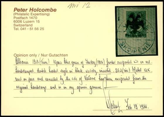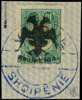 1913 10pa blue green, double headed eagle and Shqipenia opt on Turkey, INVERTED used on piece tied by cds in blue, very fine example of this scarce stamp. Peter Holcombe Certificate (1988) SG 2