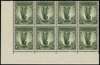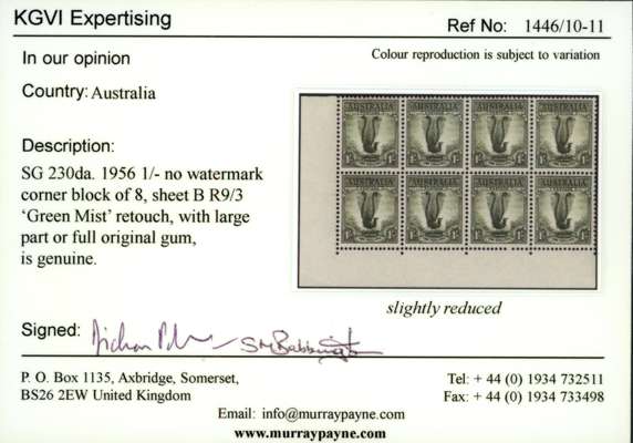1948-56 1s grey-green, no wmk, lower left corner block of 8 (4x2 -upper plate/left pane), showing "Green mist" retouch on third stamp of upper row (R9/3), large part og (six stamps, including variety are unmounted). KGVI Expertising cert (2010) fine positional piece, SG 230d/da