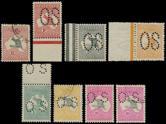 Better Roos group with £2 SG 114 fine used with (relatively inconspicuous) clipped perfs; SG O2, O3, O6 and O48 unmounted marginal examples, O6 with a crease and O48 with a bend; SG O50 and O51 (2) CTO'd, the two O51s with full or virtually full gum
