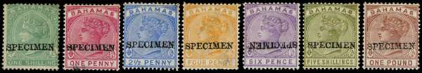 1882-98 Group of QV “SPECIMEN” overprints: 1882-98 1s green and 1884-90 set to £1 (6d optd inverted), part to large part og, a few flaws – 1s is creased, 5s has a thinned corner, some toning. A rare group thought to have been produced locally for presentation purposes. Ex "Staircase" 1999, SG 44, 49/57 VAR