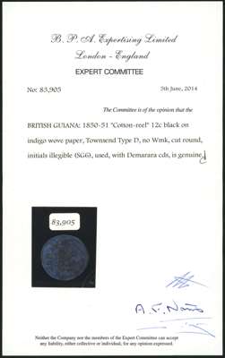 1850-51 12c indigo 'Cotton reel', Townsend type 'A', cut round, frame line complete with close to good margins, indistinct initials, used with large part 'DEMERARA' cds ('2 DE 2 1851'). A fine example of this classic rarity, with the 'indigo' recognised as the scarcest of the three 12c papers. Ex Ferrary, with BPA cert (2014), SG 6