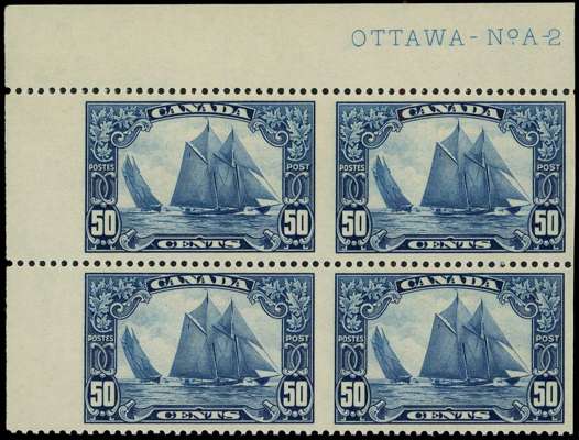 1928-29 50c 'Bluenose', upper left corner block of 4 IMPERFORATE VERTICALLY with large part 'OTTAWA - No.A-2' imprint, fresh unmounted o.g. Rare and spectacular in this positional form. Only 250 pairs existed (= ten panes of 50), making this one of ten possible plate blocks. [Insignificant marginal bend at top left corner mentioned for accuracy].