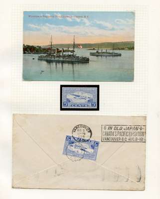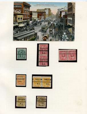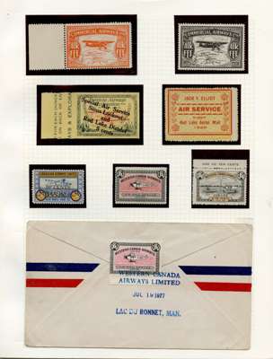 1903 set of seven o.g., the odd minor blemish on the gummed side. Also 1c Plate 48/imprint strip of four, 2c imperf pair unmounted but with sharp bend, and 20c (no gum) handstamped SPECIMEN; two pages of precancels on the KE VII set including inverts of 20c and 50c, and two pages of private Air Posts including British Columbia Airways Victoria to Vancouver First Flight cover, the stamp (with pre-affixing crease) on the reverse