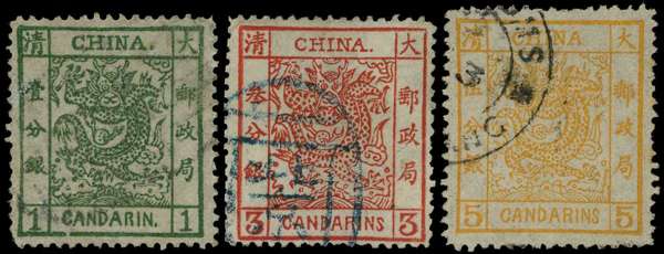 1878 1ca deep green, 3ca vermilion and 5ca yellow, 2½mm spacing on thin paper, odd shortish or lightly toned perf, first two used by light seal cancels, 5ca by part Customs cds.
