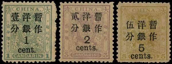1897 (May) large figure surcharge, spaced 1½mm on "Small Dragons", set of 3 to 5c on 5ca olive-yellow, 1c on 1ca rather heavily hinged, others a little toned, part to large part o.g. (cat £5100)