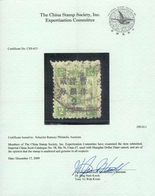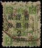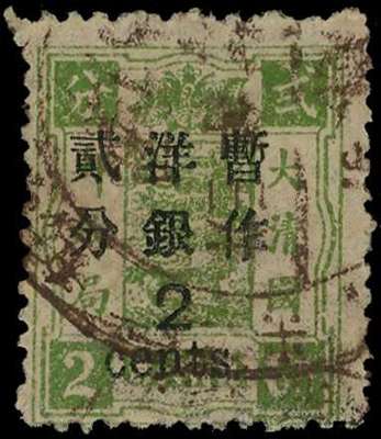 1897 (May) large figure surcharge, spaced 1½mm on Dowager original printing, 2c on 2ca green 'Emerald Lady', good used by part Shanghai dollar chop in brown, rare even in used condition, with 2009 CSS cert