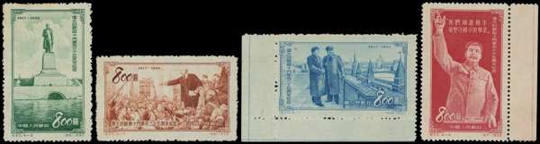 1953 (Feb) 35th Anniversary of the Russian Revolution, set of 4 bearing the erroneous inscription 'Soviet Union', these were ordered to be withdrawn when the error was noticed, however they were sold at a few remote post offices in western Hunan province for about a month, similar stamps without this inscription and in changed colours were issued in October 1953, $800 blue with a tiny natural inclusion which is mentioned for accuracy, fine unused and very rare thus as most were commercially used
