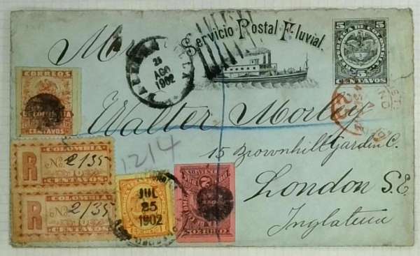 1865-1950 Columbia collection on album leaves with much for the specialist, 1902-04 Barranquilla issues, 1902 Medellin issues to 10p, 1917 Registration issue die proofs (2), 1917 AR issue die proof on paper, attractive 1903 registered “Servicio Postal Fluvial” cover to London, also a few useful Argentina and Chile pages with early issues. Generally fine, close inspection recommended.