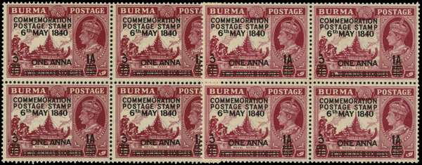 1934 Stamp Centenary 1a on 2a6p large part o.g. blocks of four with R7/8 broken bar and 15/3 birds over trees. SG 34, a, b, £230
