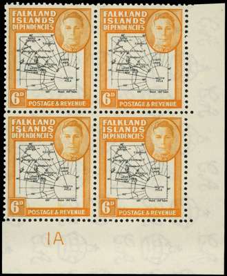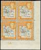 1946 Thick Map 6d ochre Plate 1A block of four, hinged on the selvedge only, the stamps unmounted o.g. R5/9 broken arc, one shortish perf at top. SG G6e, ea, £255