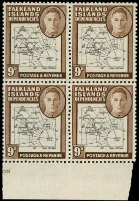1946 Thick Map 9d black and brown positional block of four, Plate 2 R6/8 SOUTH POKE, unmounted o.g. SG G7c, £170