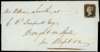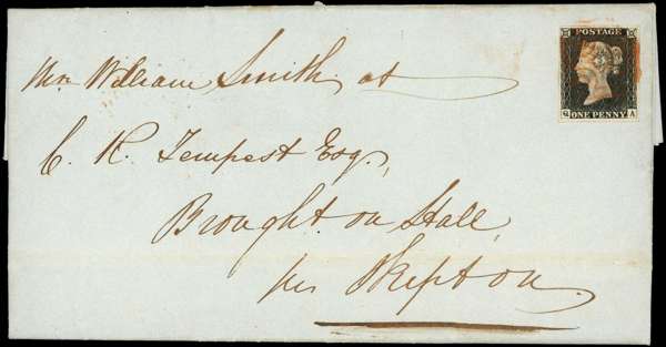 1840 1d black, plate 3, lettered QA, neatly tied with red MC on cover to Skipton, backstamped Bradford (27 JY 1840), horizontal file fold not affecting the stamp, which has four clear to wide margins, fine appearance, SG 2