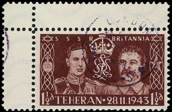 1937 1½d Coronation German propaganda forgery depicting King George VI and Stalin inscribed TEHERAN 28 11 1943, fine ‘used’ with violet cancel, margins at left and top