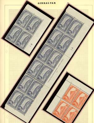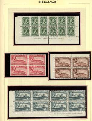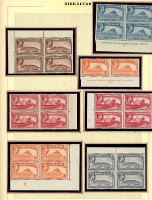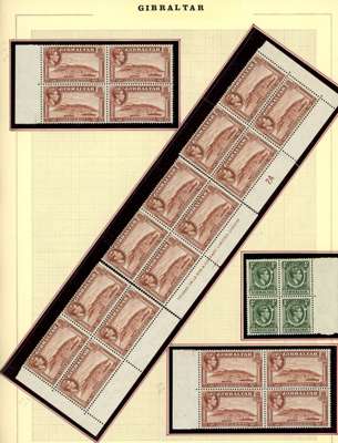 1938-51 definitive multiples unmounted o.g., blocks of four of each plus some other multiples; some are plate or imprint blocks (1/- frame plate 2, 2/- and 5/- vignette plate 1). Useful group, some being early printings with off-white gum. SG 121-131