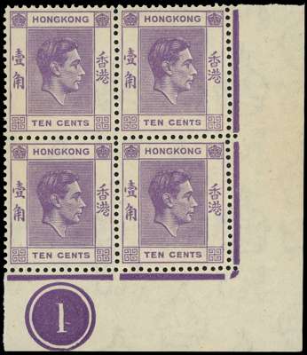 1938-45 10c bright violet Plate 1 block from lower right corner of sheet, fine unmounted o.g. SG 145, £200