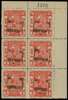 1948-9 2a vermilion corner block of six with sheet number, part patchy o.g. with adhesions. SG 4A, £168