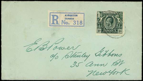 1926 registered cover addressed to New York bearing a single 1922 10/- KGV tied by an indistinct oval registration cancel, transit marks on reverse, SG 106
