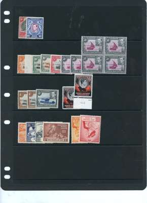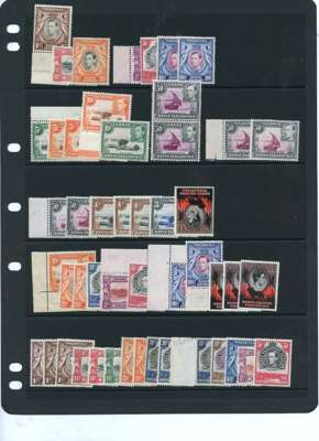 1938-54 set o.g. collection (73) on two Hagner sheets, all unmounted unless stated. Arranged per CW catalogue. Perf 13¼ (no 30c) with both printings of the 10/-; perf 13 x 11¾ with 50c vertical pair, lower stamp with rope joined to sail (normal stamp hinged, excellent gum) and the four 50c shades, the £1 lightly hinged; perf 14 complete with both printings of the 10/-; perf 13¼ x 13¾ to 10/-; perf 13 x 12½ with 50c block of four, lower left stamp with dot remaining. Also S. Wedding hinged mint. SG 131-150b