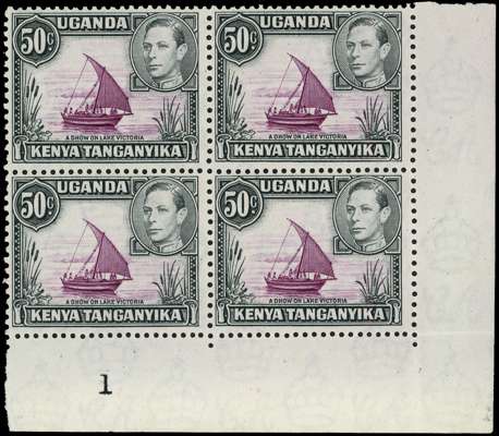 1938-47 50c purple and black, perf 13 x 11¾. Unmounted o.g. lower right corner block of four with Frame Plate 1 under R10/9, white gum. SG 144