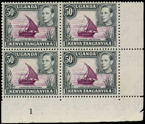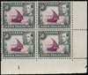 1938-47 50c purple and black, perf 13 x 11¾. Unmounted o.g. lower right corner block of four with Frame Plate 1 under R10/9, white gum, selvedge creasing in lower right corner. SG 144