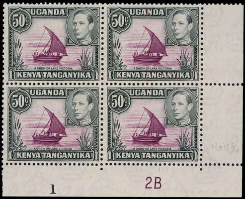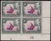 1938-47 50c purple and black, perf 13 x 11¾. Unmounted o.g. lower right corner block of four with Plate 1-2B, unmounted o.g., white gum. SG 144