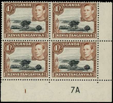 1949-54 1/- black and brown, perf 13 x 12½. Unmounted o.g. Plate 1-7A block of four, R9/9 with retouch in lake at extreme right. SG 145b