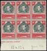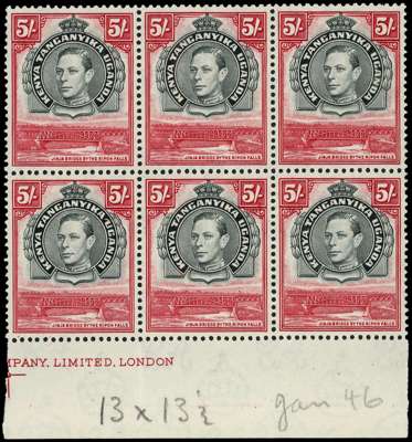 1944-54 5/- perf 13¼ x 13¾ bottom marginal block of six with part imprint, unmounted o.g., one vertical fold. Identified as Jan 46 printing in pencil on selvedge. SG 148b, £330