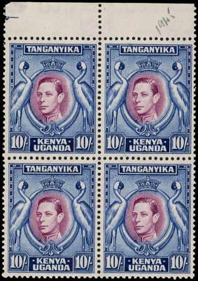 1944-54 10/- reddish purple and blue perf 13¼ x 13¾ top marginal block of four, o.g., hinged on the selvedge only. Identified as the 1945 printing. SG 149b, £260