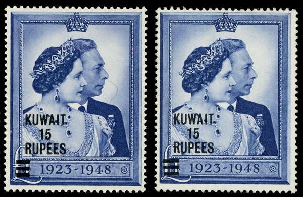 1948 Silver Wedding 15r on £1 blue, R3/4 short bars, unmounted o.g. With unmounted normal stamp for comparison. SG 75, a, £288